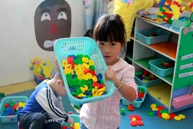早教班里,小孩自己坐小桌,拼积木,妈妈在玻璃外面比个OK。